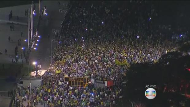 Manifestantes fecharam um dos sentidos da Avenida Paulista para protestar contra a nomeação do ex-presidente Luiz Inácio Lula da Silva para a Casa Civil e contra o governo Dilma. Eles estão concentrados no Museu de Arte de São Paulo (Masp) e vestem camisas do Brasil, seguram bandeiras e cartazes contra a presidenta Dilma Rousseff e o ministro Lula. Eles cantam o Hino Nacional, entoam palavras de ordem contra o governo petista, gritam “Renuncia, renuncia”, batem panelas e fazem barulhos com vuvuzelas.